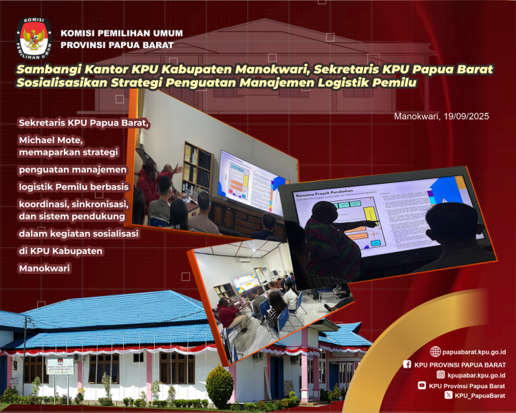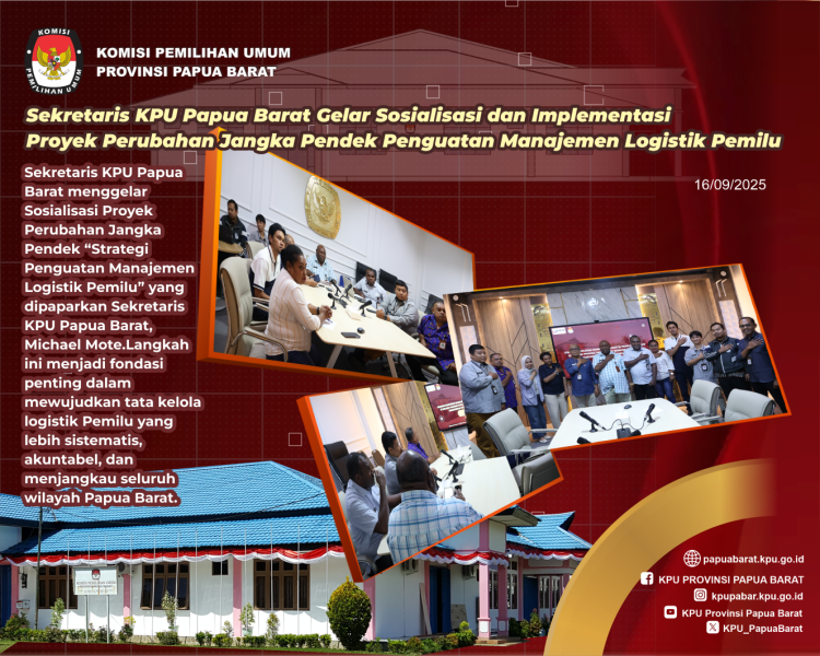 Manokwari — Komisi Pemilihan Umum (KPU) Provinsi Papua Barat menggelar kegiatan Sosialisasi dan Implementasi Pelaksanaan Proyek Perubahan Jangka Pendek yang dipaparkan langsung oleh Sekretaris KPU Papua Barat, Michael Mote, Selasa (16/9/2025) bertempat di Media Center KPU Papua Barat. Kegiatan ini merupakan bagian dari program Pelatihan Kepemimpinan Nasional (PKN) Tingkat II Angkatan XV Tahun 2025, yang sedang diikuti oleh Michael Mote. Acara dihadiri oleh para pejabat struktural KPU Papua Barat, antara lain Dominggus Kambu (Kepala Bagian Keuangan, Umum, dan Logistik), Henry Jackson (Kepala Bagian Perencanaan, Data dan Informasi, Partisipasi, Humas, dan SDM), serta para kepala subbagian: Marqaline E. Kaiway, Herlina Margaretha Isir, Kurniawan Eko Sambodo, dan Robison Onicius Jeujanan. Strategi Penguatan Manajemen Logistik Pemilu Papua Barat Dalam paparannya, Michael Mote menyampaikan proyek perubahan berjudul: “Strategi Penguatan Manajemen Logistik Pemilihan Umum di Wilayah Provinsi Papua Barat Berbasis Koordinasi, Sinkronisasi, dan Sistem Pendukung.” Proyek perubahan ini berangkat dari realitas geografis Papua Barat yang terdiri dari wilayah pegunungan, kepulauan, dan pesisir, dengan keterbatasan akses transportasi serta infrastruktur. Kondisi tersebut selama ini menjadi tantangan besar dalam pengelolaan logistik Pemilu, mulai dari proses pelipatan, sortir, pengesetan, pengepakan, hingga distribusi ke tempat pemungutan suara (TPS), khususnya di daerah sulit dijangkau seperti Pegunungan Arfak, Teluk Wondama, Teluk Bintuni, Kaimana, dan Fakfak. “Tujuan utama proyek ini adalah menciptakan tata kelola logistik Pemilu yang sistematis, efisien, akuntabel, mampu menjangkau wilayah terpencil, serta menjamin hak pilih masyarakat secara adil dan setara,” ungkap Michael. Milestone Jangka Pendek Untuk menjawab tantangan tersebut, Michael memaparkan beberapa langkah strategis jangka pendek, antara lain: Penyusunan laporan proyek perubahan dan pengesahan SOP teknis sortir, lipat, pengesetan, serta pengepakan surat suara. Rekrutmen dan pelatihan tenaga lapangan dengan supervisi harian. Penataan ruang kerja logistik dengan standar keamanan dan efisiensi. Penerapan sistem digital monitoring untuk laporan progres logistik secara real-time. Identifikasi daerah sulit akses dan penyediaan moda transportasi alternatif, mulai dari longboat, helikopter, hingga kendaraan 4x4. Penjelasan teknis lebih lanjut disampaikan oleh Dominggus Kambu, yang menekankan pentingnya penyusunan SOP baku, penataan gudang logistik, serta digitalisasi monitoring distribusi logistik guna meminimalisir keterlambatan dan potensi manipulasi data. Kesepakatan dan Harapan Dari diskusi yang berlangsung, disepakati beberapa hasil penting, di antaranya: Penetapan SOP sortir, lipat, pengesetan, pengepakan, dan distribusi logistik Pemilu di Papua Barat. Penetapan desain gudang logistik dengan alur penyimpanan yang efisien. Penyusunan SOP distribusi khusus untuk daerah 3T (Tertinggal, Terdepan, Terluar). Kriteria baku rekrutmen dan pelatihan tenaga sortir/lipat surat suara. Kegiatan ini diharapkan menjadi fondasi awal dalam mewujudkan tata kelola logistik Pemilu di Papua Barat yang lebih terukur, transparan, dan akuntabel, sekaligus memperkuat koordinasi dengan berbagai pihak untuk mendukung kelancaran penyelenggaraan Pemilu 2024.