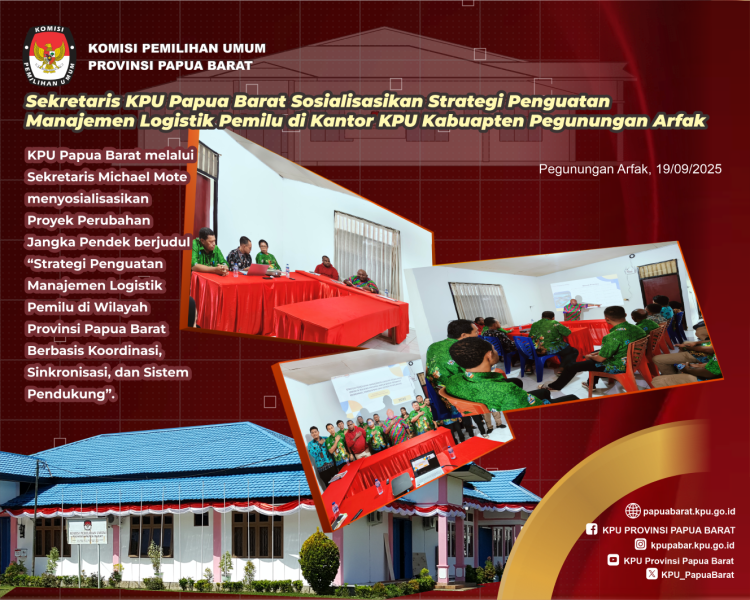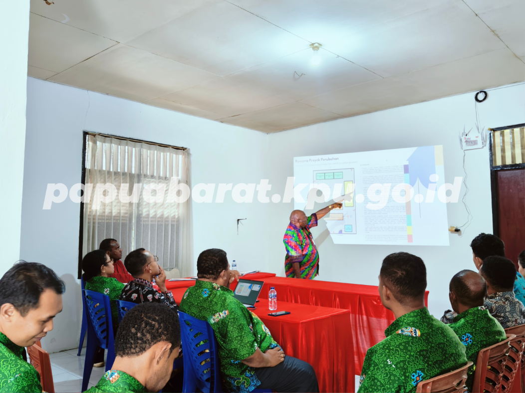 Pegunungan Arfak, 19/09/2025 – Komisi Pemilihan Umum (KPU) Provinsi Papua Barat terus berupaya memperkuat tata kelola logistik Pemilu dengan strategi berbasis koordinasi, sinkronisasi, dan sistem pendukung modern. Hal ini ditegaskan Sekretaris KPU Provinsi Papua Barat, Michael Mote, saat menyampaikan Sosialisasi dan Implementasi Pelaksanaan Proyek Perubahan Jangka Pendek di Kantor KPU Kabupaten Pegunungan Arfak, Jumat (19/9/2025).