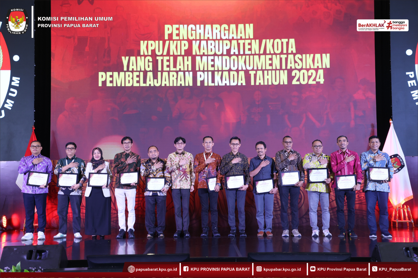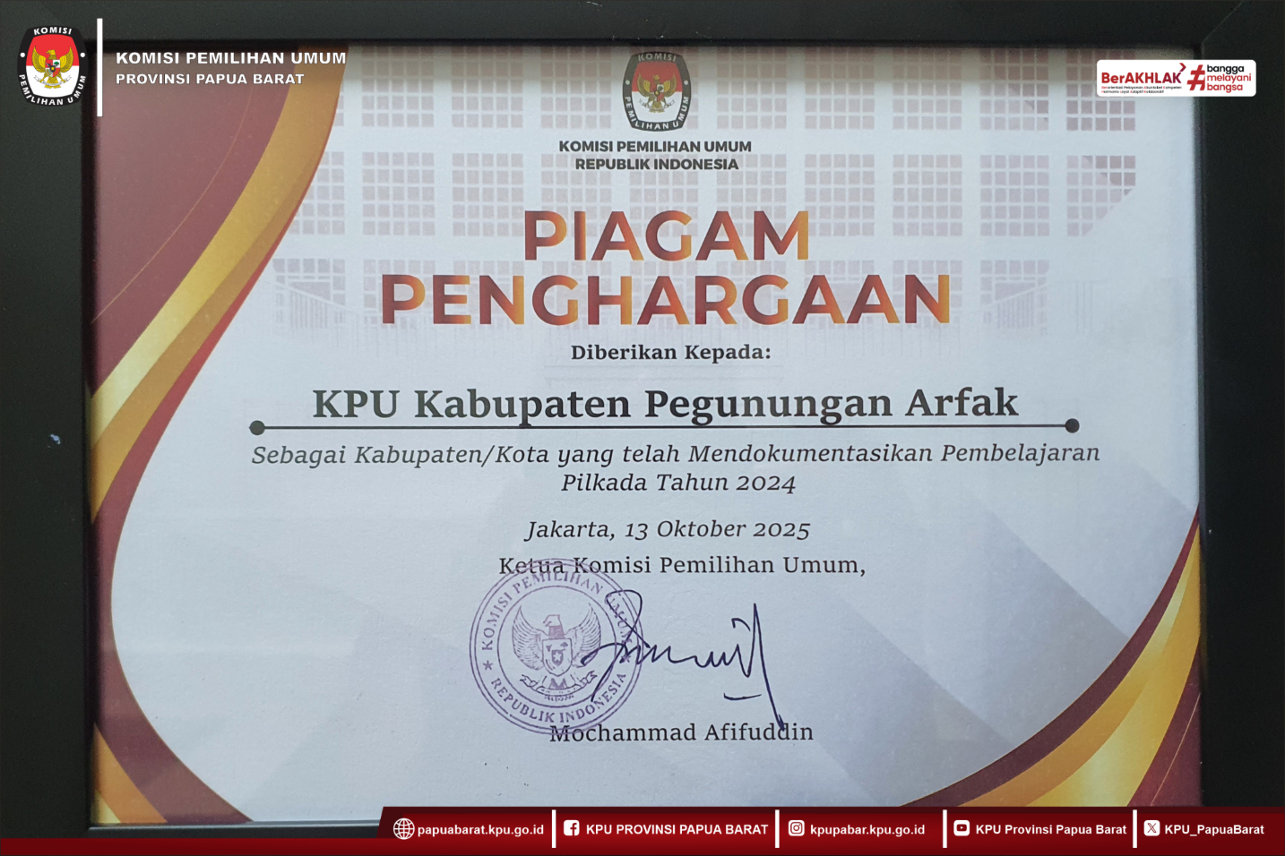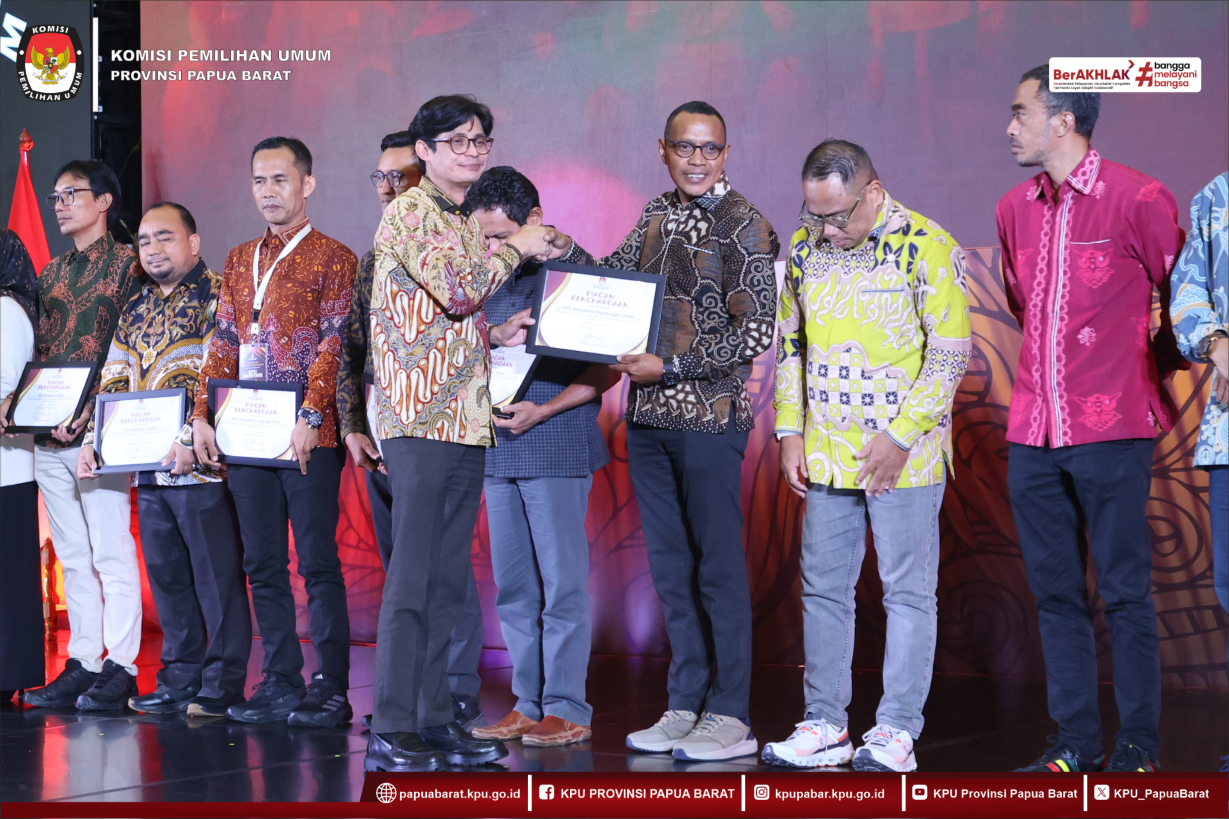 Dalam sela-sela kegiatan, KPU RI melalui Anggota KPU August Mellaz menyerahkan piagam penghargaan kepada sejumlah satuan kerja (satker) dengan capaian tertentu. Salah satu yang menerima penghargaan adalah KPU Kabupaten Pegunungan Arfak, yang dinobatkan dalam kategori Mendokumentasikan Pembelajaran Pilkada 2024. Piagam tersebut diterima langsung oleh Abdon Retraubun mewakili Papua Barat.