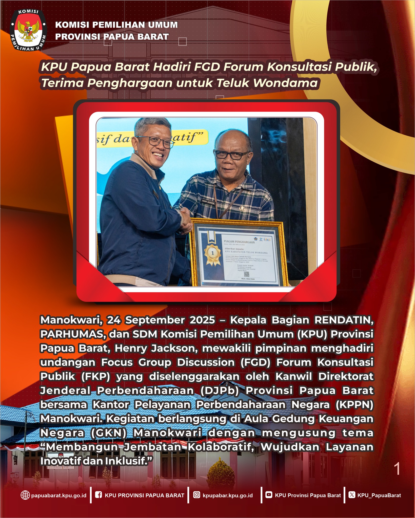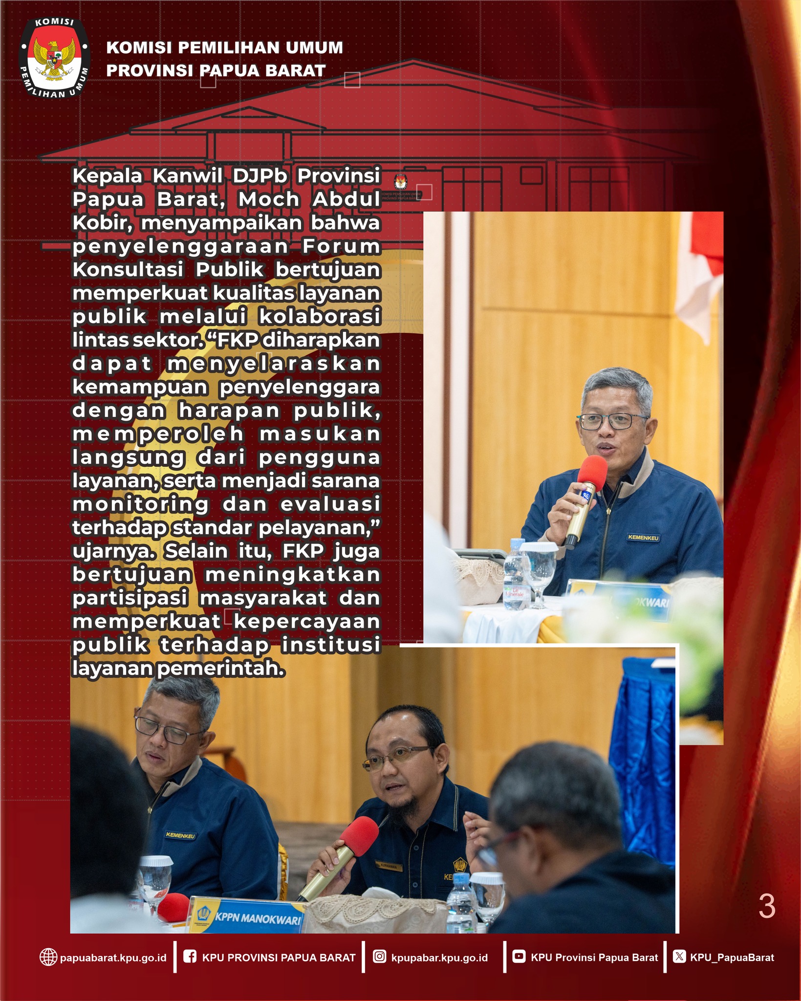 Berikut kolase saat Kepala Bagian RENDATIN, PARHUMAS, dan SDM KPU Papua Barat, Henry Jackson, mewakili pimpinan menghadiri FGD Forum Konsultasi Publik (FKP) yang digelar Kanwil DJPb Papua Barat dan KPPN Manokwari, Rabu (24/9/2025) di Aula Gedung Keuangan Negara Manokwari.