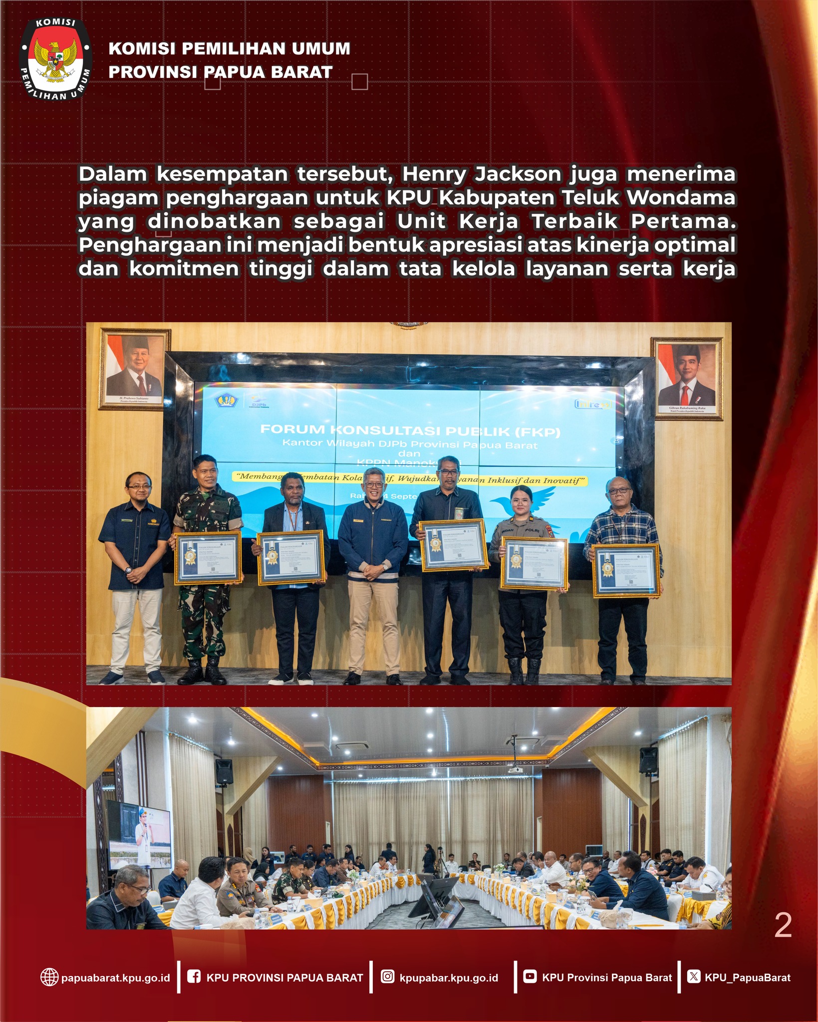 Pada kesempatan tersebut, KPU Kabupaten Teluk Wondama menerima penghargaan sebagai Unit Kerja Terbaik Pertama yang diserahkan kepada perwakilan KPU Papua Barat.