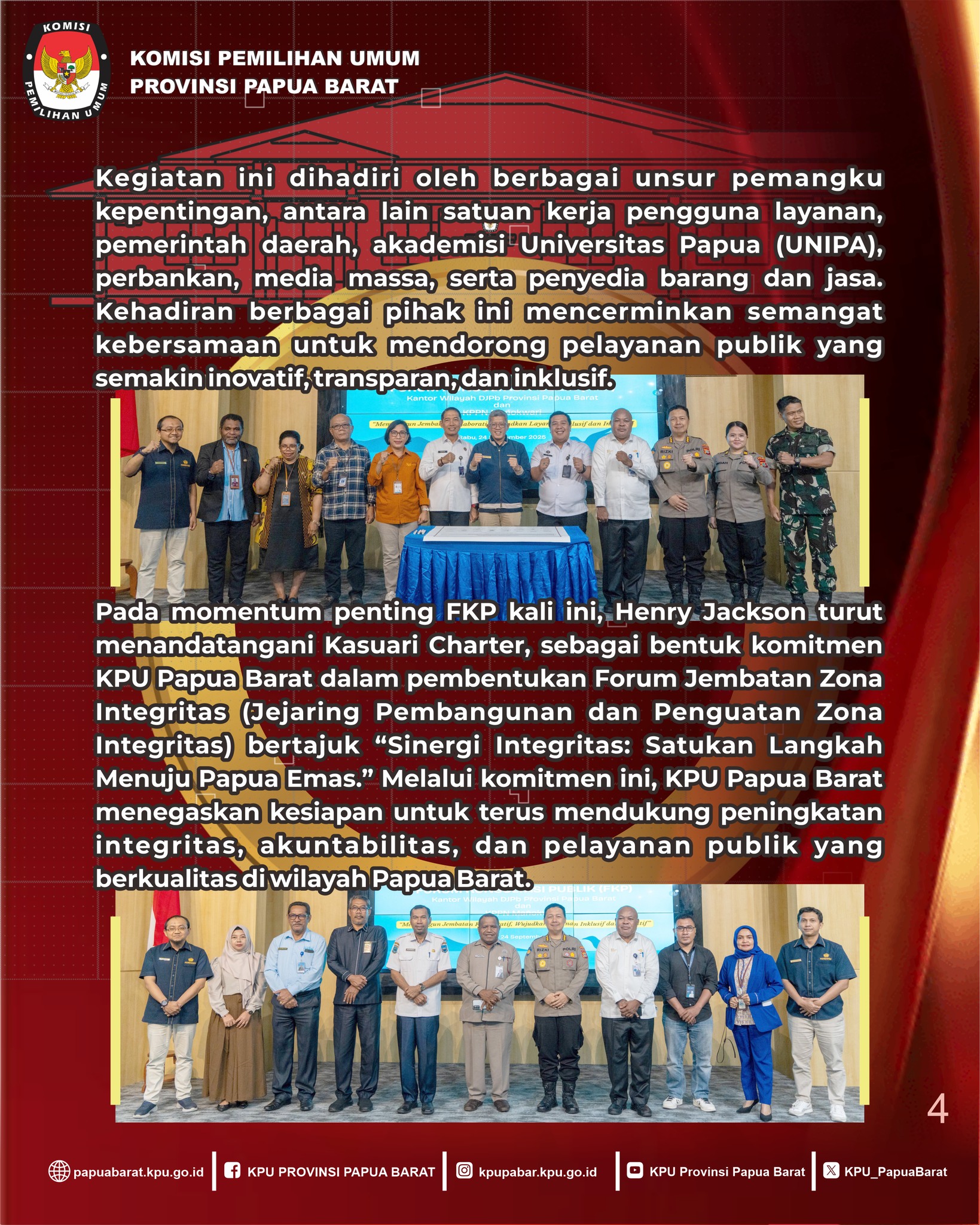 Selain itu, KPU Papua Barat juga turut menandatangani Kasuari Charter, komitmen bersama pembentukan Forum Jembatan Zona Integritas bertajuk “Sinergi Integritas: Satukan Langkah Menuju Papua Emas.”