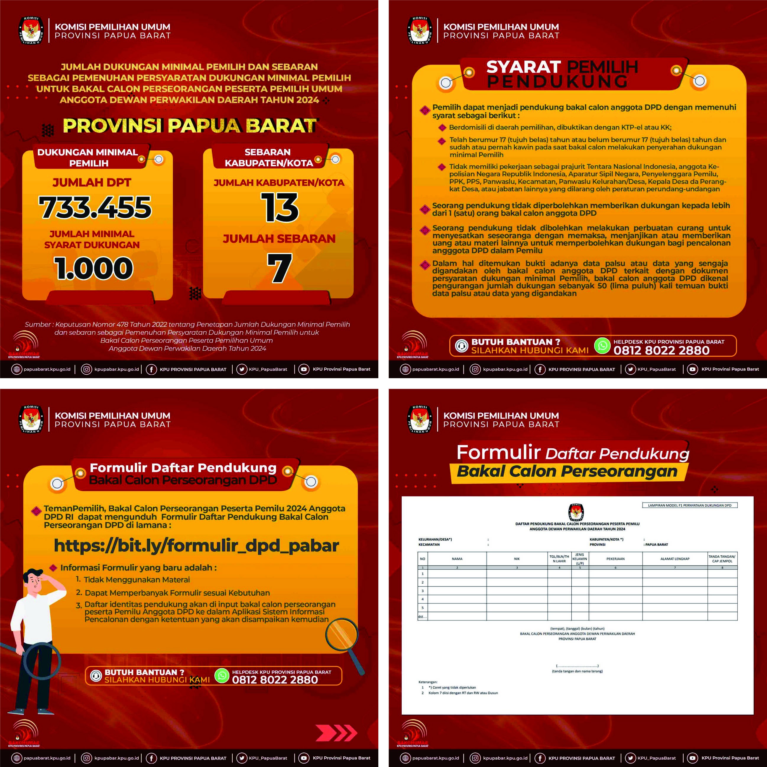 Berdasarkan Keputusan KPU Nomor 478 Tahun 2022 tersebut, untuk Provinsi Papua Barat telah ditetapkan berdasarkan Jumlah Daftar Pemilih Tetap (DPT) sebanyak 733.465, maka Bakal Calon Perseorangan Peserta Pemilihan Umum Anggota Dewan Perwakilan Daerah Tahun 2024 ditentukan untuk mengumpulkan dukungan minimal sejumlah 1.000 dukungan, yang tersebar minimal di 13 kabupaten/kota di Provinsi Papua Barat.