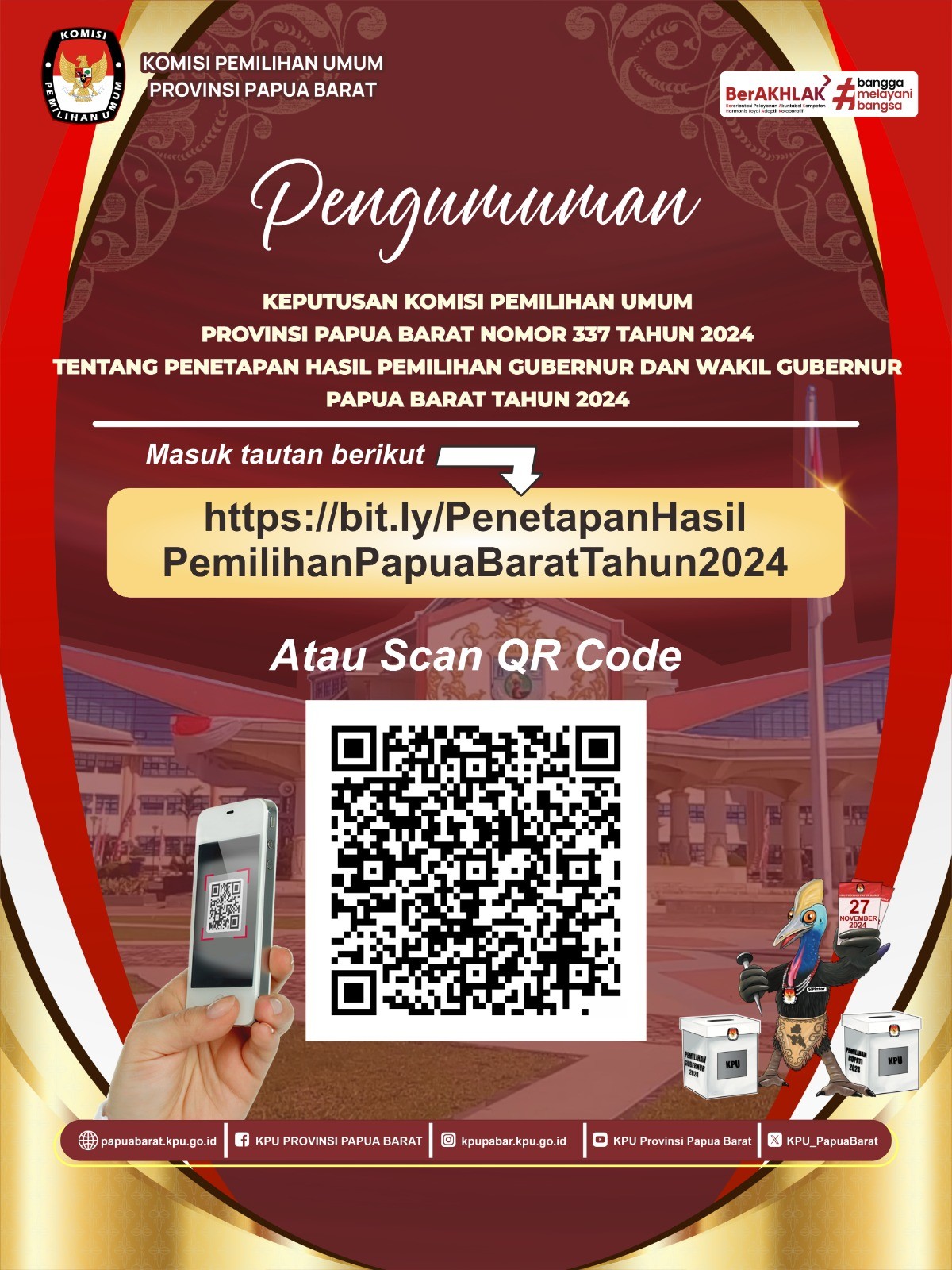 KEPUTUSAN KPU PROVINSI PAPUA BARAT NOMOR 337 TAHUN 2024 TENTANG PENETAPAN HASIL PEMILIHAN GUBERNUR DAN WAKIL GUBERNUR PAPUA BARAT TAHUN 2024 Minggu, 08 Desember 2024 23:59 1005 Selengkapnya klik >>Disini<< Bagikan: Dilihat 1,005 Kali.