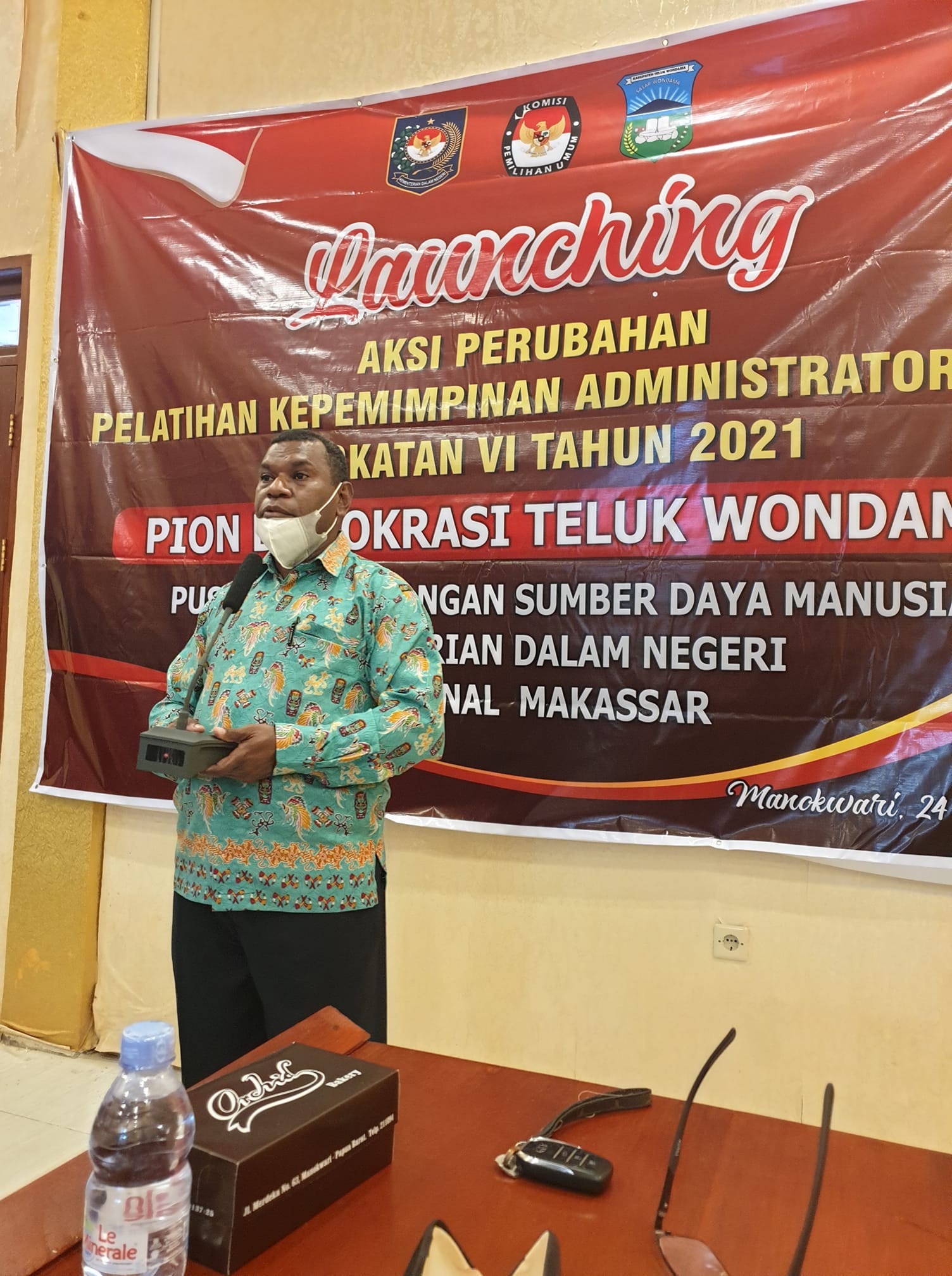 Ketua KPU Provinsi Papua Barat Paskalis Semunya memberikan arahan pada Launching Aksi Perubahan Pelatihan Kepemimpinan Administrator (PKA) Angkatan VI Tahun 2021 berjudul "Pion Demokrasi Teluk Wondama" atas nama reformer Henry Jackson Purba, Jum'at (24/9/2021).