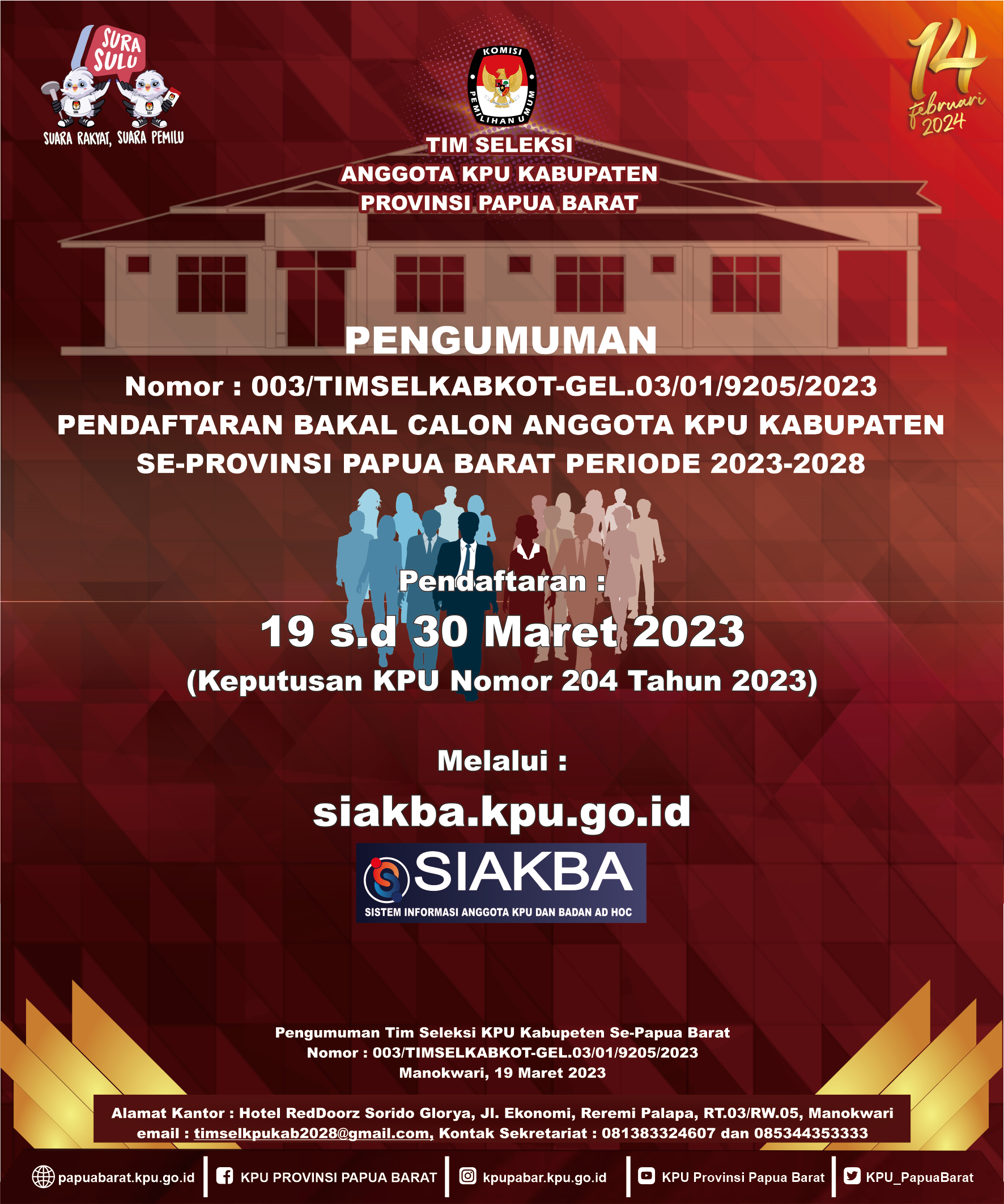 menerbitkan Pengumuman nomor: 003/TIMSELKABKOTA-GEL.03-/01/9205/2023 tanggal 19 Maret 2023 tentang Pendaftaran Bakal Calon Anggota KPU Kabupaten Se-Papua Barat Periode 2023-2028.