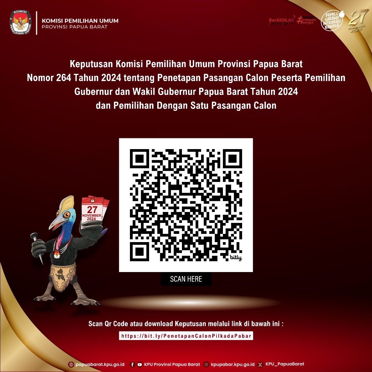 KEPUTUSAN KOMISI PEMILIHAN UMUM PROVINSI PAPUA BARAT NOMOR 264 TAHUN 2024 TENTANG PENETAPAN PASANGAN CALON PESERTA PEMILIHAN GUBERNUR DAN WAKIL GUBERNUR PAPUA BARAT TAHUN 2024 DAN PEMILIHAN DENGAN SATU PASANGAN CALON