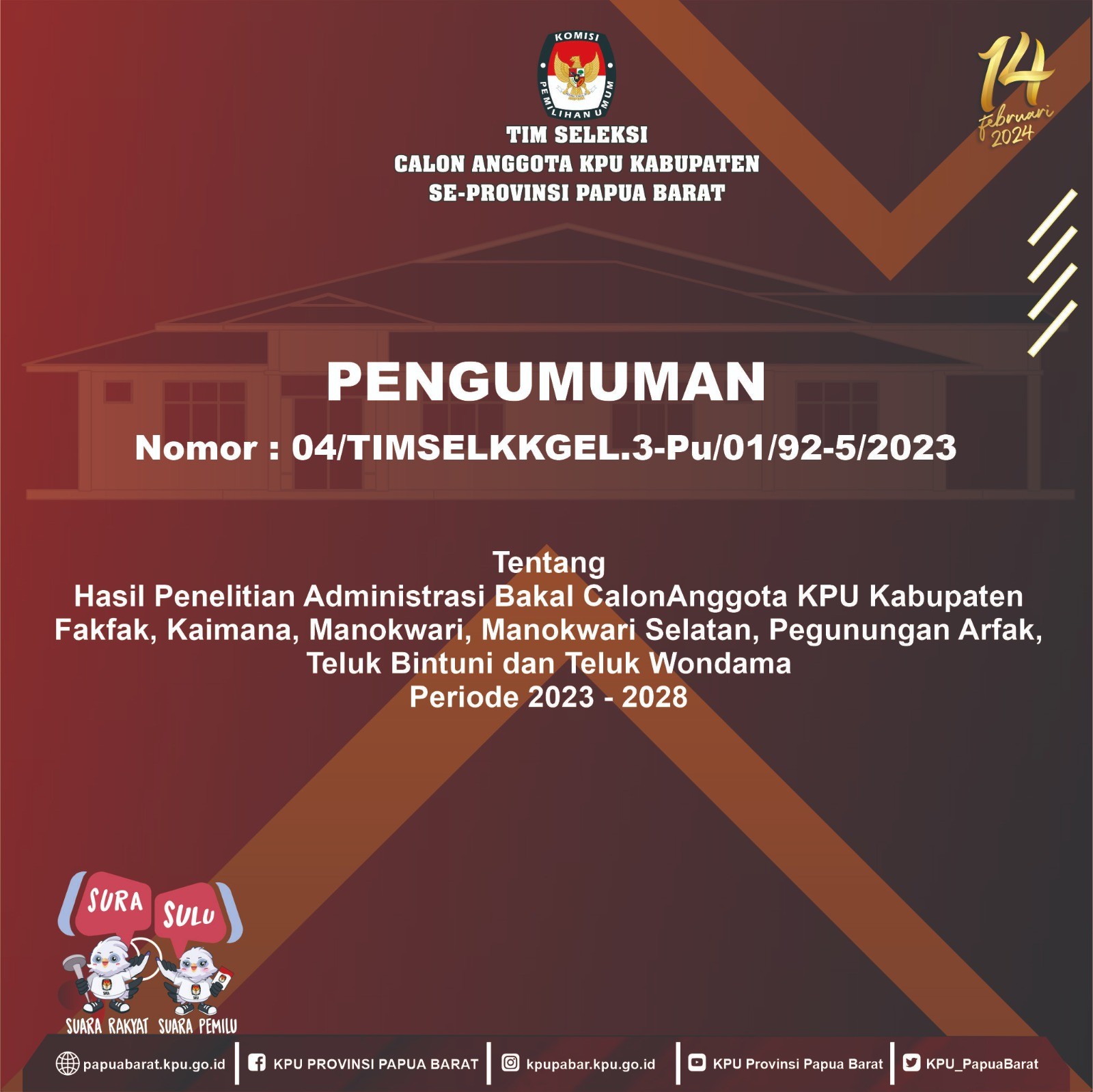 Pengumuman Hasil Penelitian Administrasi Bakal Calon Anggota KPU Kabupaten Se-Provinsi Papua Barat