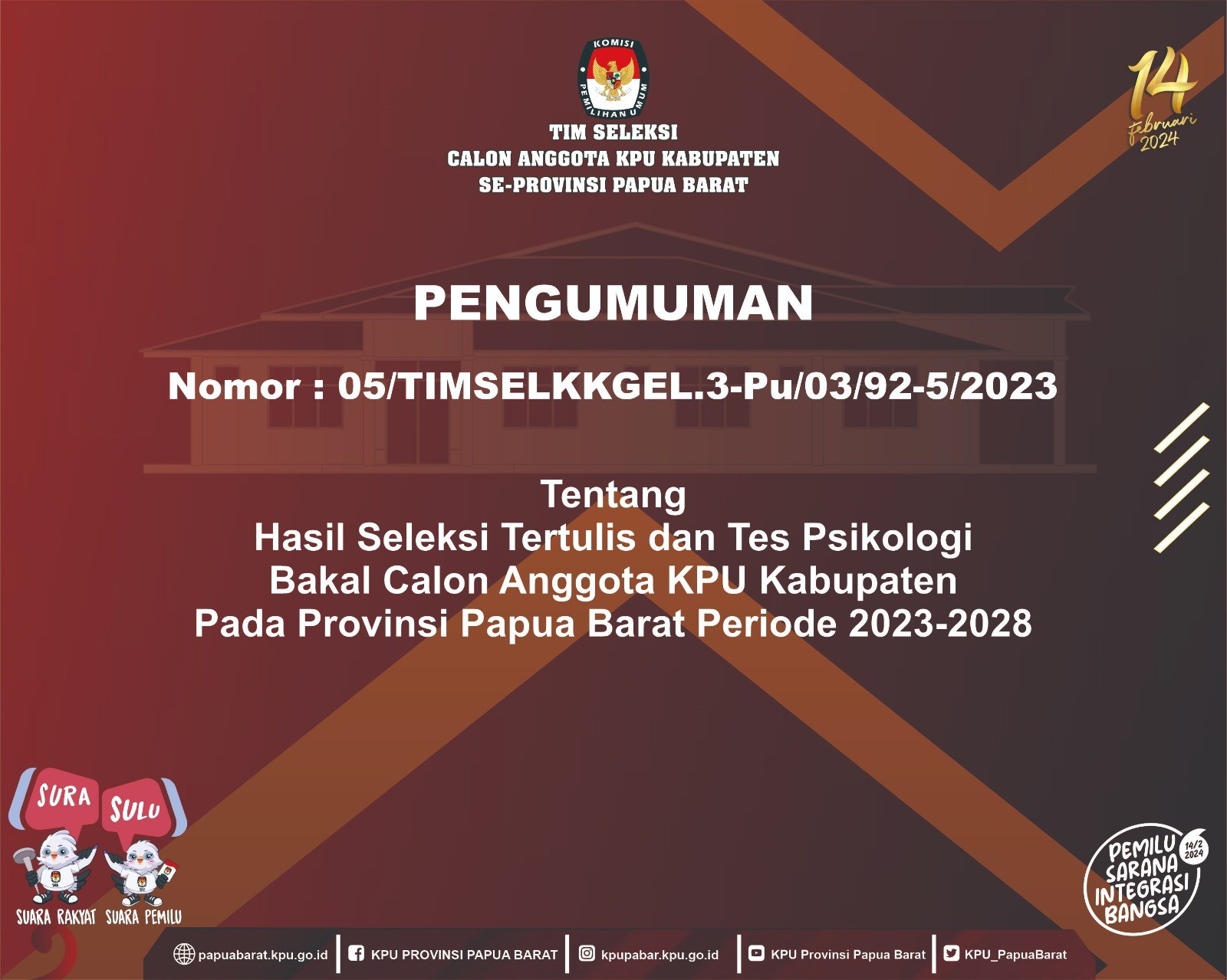 PENGUMUMAN HASIL SELEKSI TERTULIS TES PSIKOLOGI BAKAL CALON ANGGOTA KPU KABUPATEN PADA PROVINSI PAPUA BARAT PERIODE 2023-2028