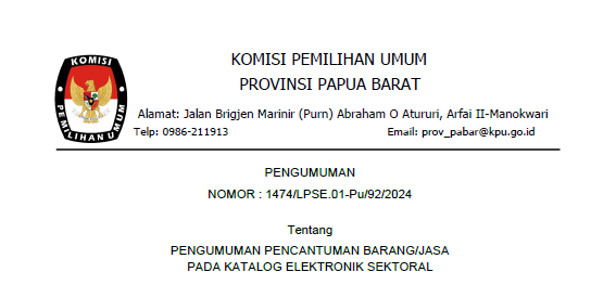 PENGUMUMAN NOMOR : 1474/LPSE.01-Pu/92/2024 Tentang PENGUMUMAN PENCANTUMAN BARANG/JASA PADA KATALOG ELEKTRONIK SEKTORAL