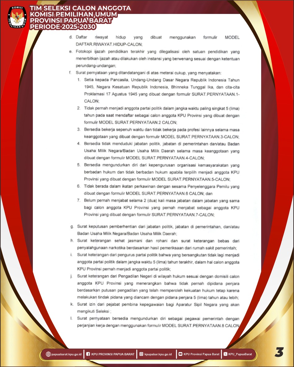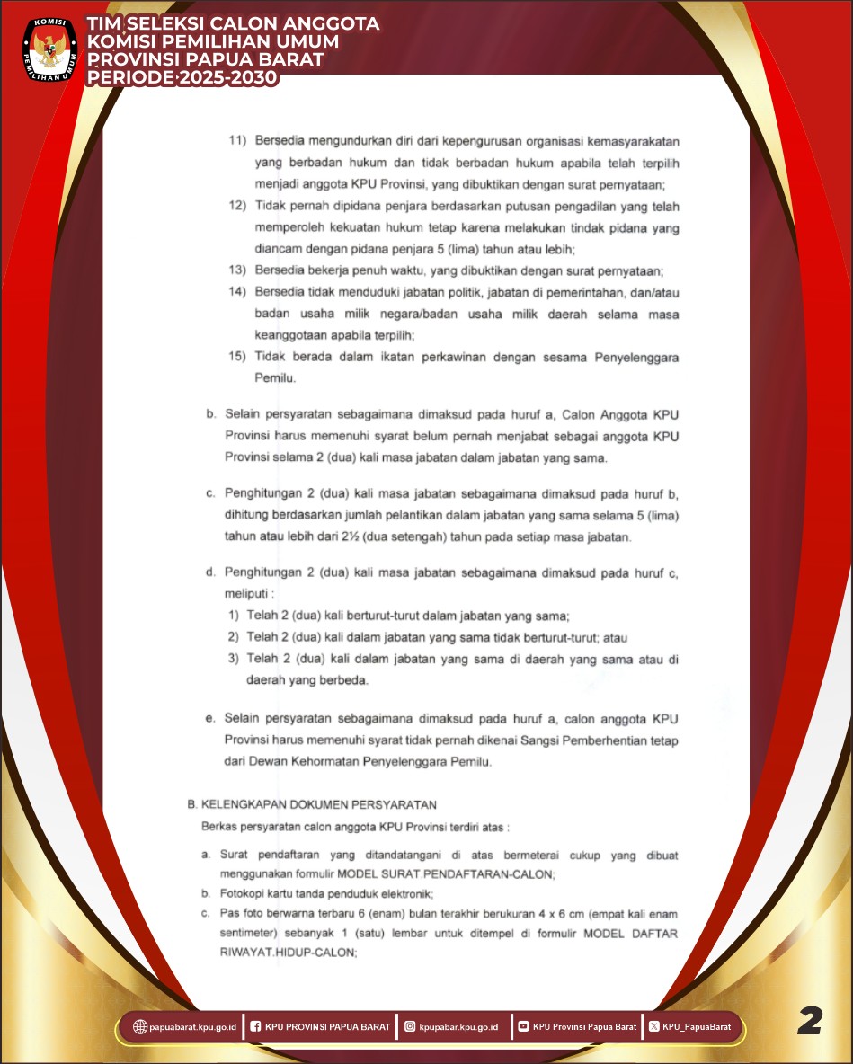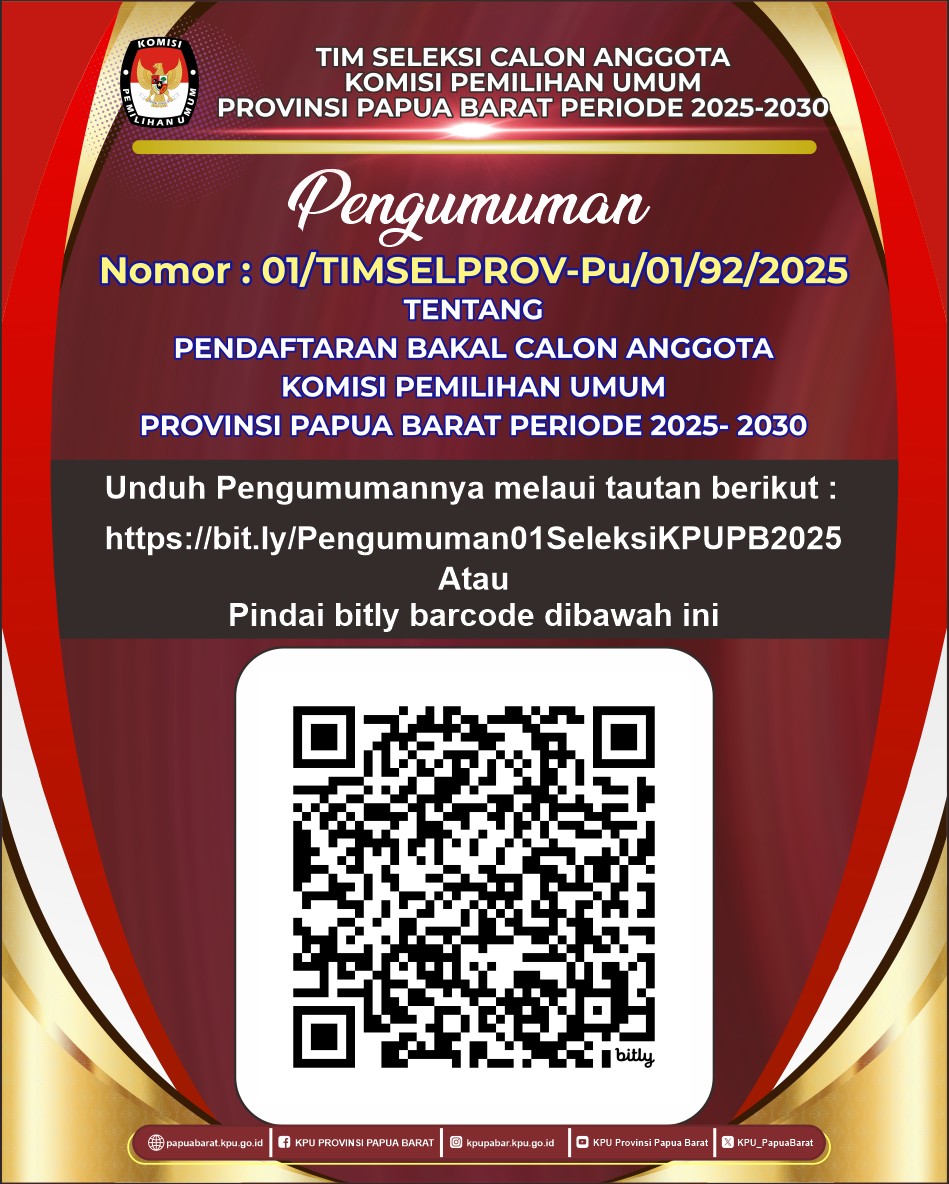 Manokwari, Papua Barat (06/05/2025) Tim Seleksi Calon Anggota Komisi Pemilihan Umum (KPU) Provinsi Papua Barat Periode 2025–2030 telah menerbitkan Pengumuman Nomor 01/TIMSELPROV-Pu/01/92/2025 tentang Pendaftaran Bakal Calon Anggota KPU Provinsi Papua Barat Periode 2025–2030.