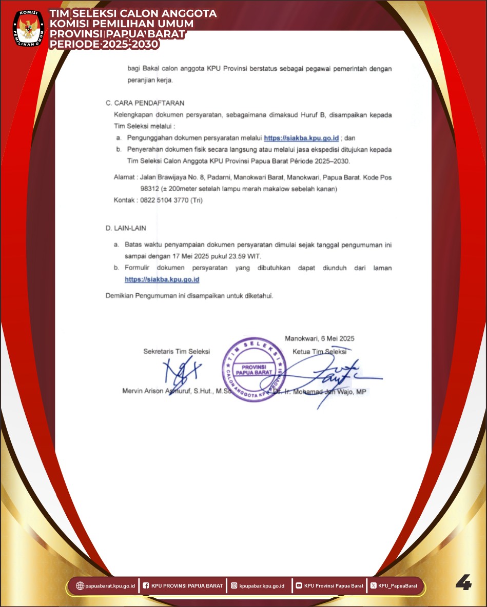 Pengumuman Pendaftaran Calon Anggota KPU Provinsi Papua Barat Periode 2025-2030