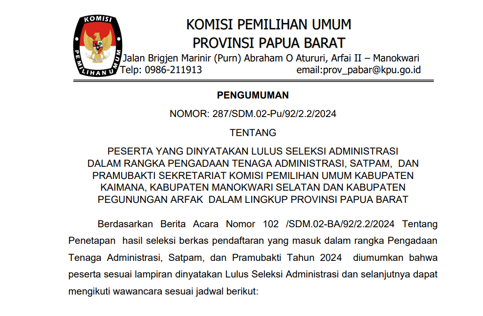 PENGUMUMAN NOMOR: 287/SDM.02-Pu/92/2.2/2024 TENTANG PESERTA YANG DINYATAKAN LULUS SELEKSI ADMINISTRASI DALAM RANGKA PENGADAAN TENAGA ADMINISTRASI, SATPAM, DAN PRAMUBAKTI SEKRETARIAT KOMISI PEMILIHAN UMUM KABUPATEN KAIMANA, KABUPATEN MANOKWARI SELATAN DAN KABUPATEN PEGUNUNGAN ARFAK DALAM LINGKUP PROVINSI PAPUA BARAT