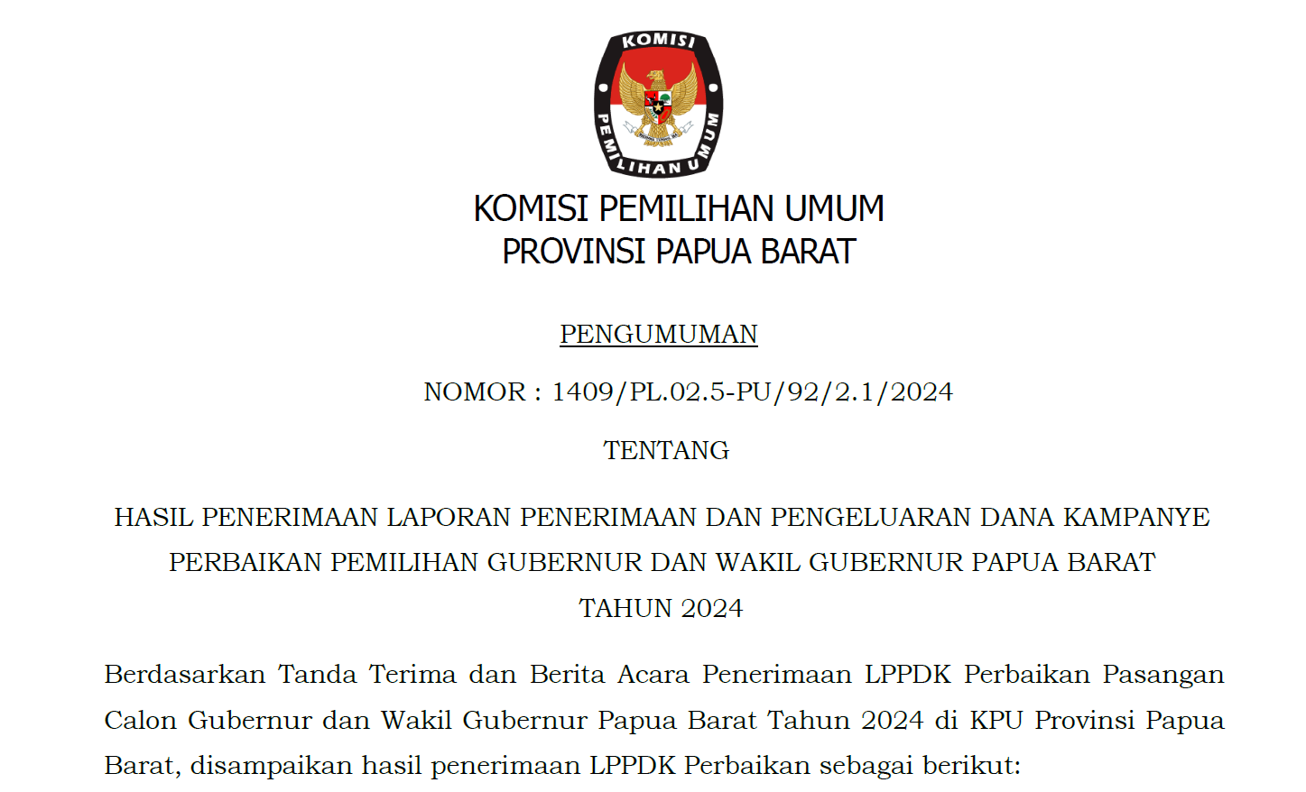 PENGUMUMAN HASIL PENERIMAAN LAPORAN PENERIMAAN DAN PENGELUARAN DANA KAMPANYE PERBAIKAN PEMILIHAN GUBERNUR DAN WAKIL GUBERNUR PAPUA BARAT TAHUN 2024