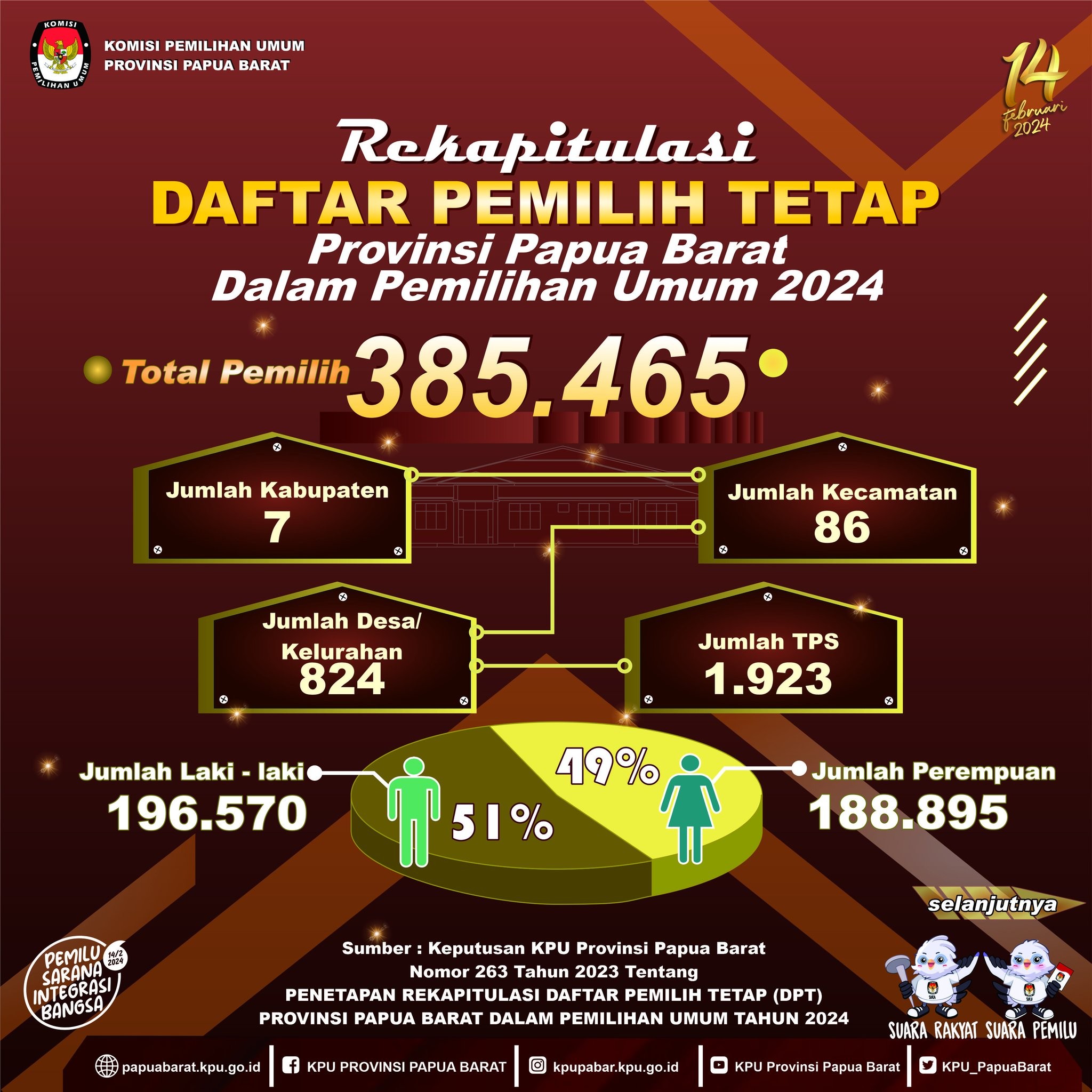 #KakaTemanPemilih, Berikut Infografis Rekapitulasi Daftar Pemilih Tetap (DPT) Provinsi Papua Barat pada Pemilu Serentak Tahun 2024.