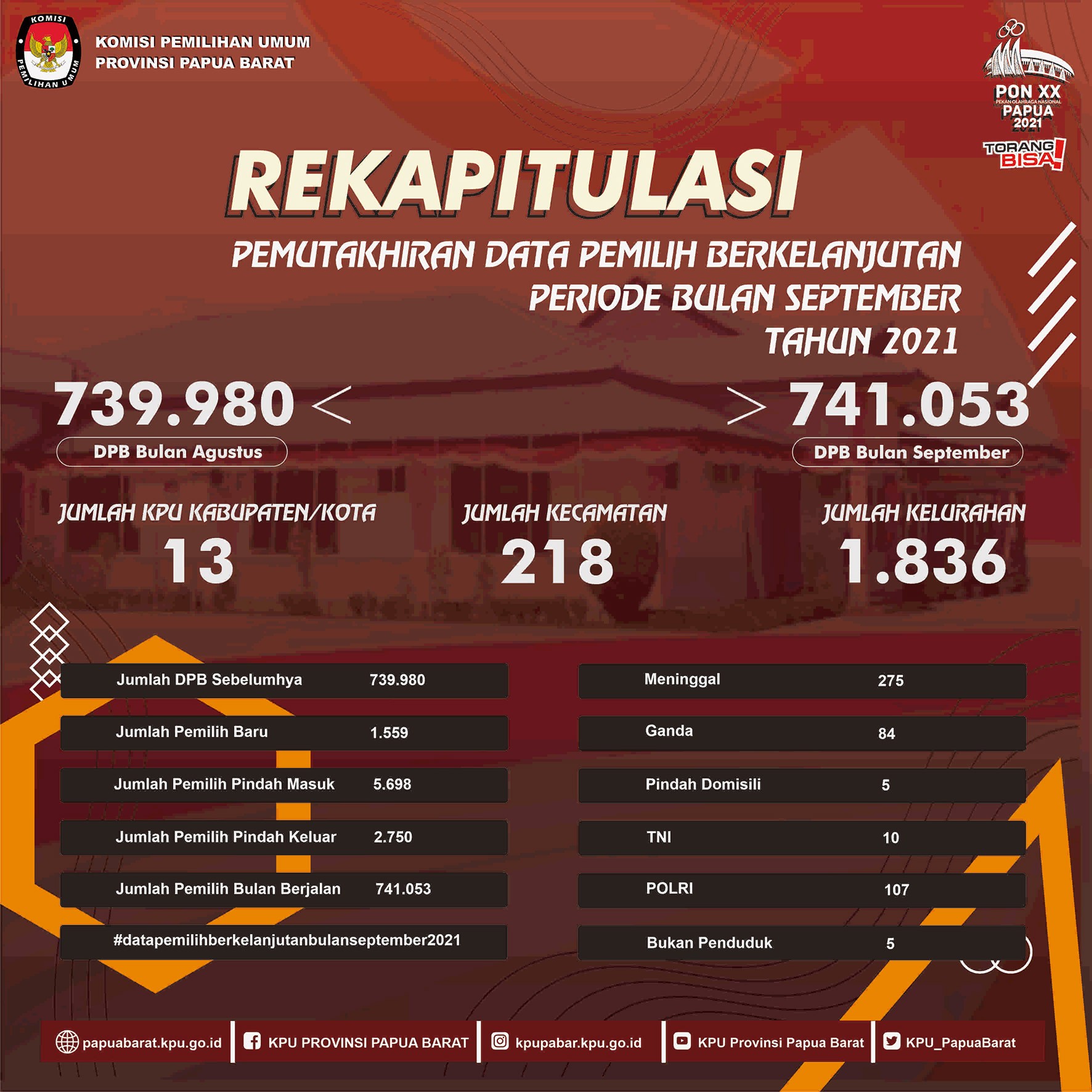 Berikut hasil rekapitulasi pemutakhiran data pemilih periode bulan September tahun 2021 oleh KPU Provinsi Papua Barat di Bagian Program & Data.