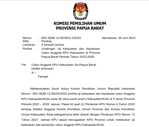 Berikut Undangan dan Jadwal Pelaksanaan Uji Kelayakan dan Kepatutan Calon Anggota KPU Kabupaten di Provinsi Papua Barat Periode Tahun 2023 - 2028